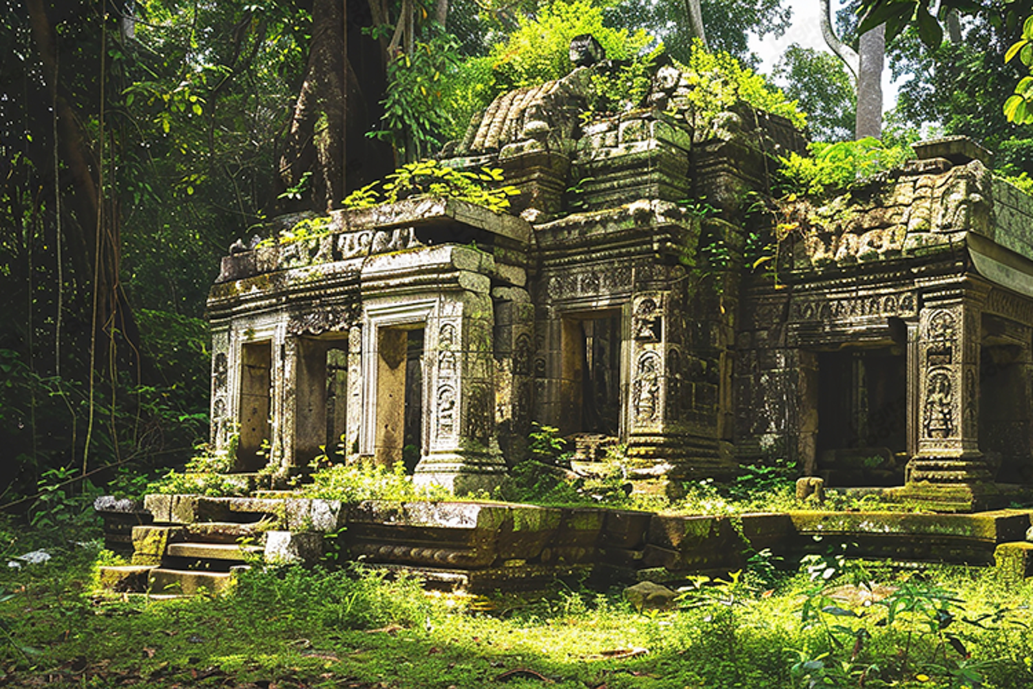 Transport your creative projects to a forgotten world with this high-resolution ancient jungle temple background. The composition features a majestic, multi-tiered stone temple complex partially reclaimed by nature. The artwork showcases intricate architectural carvings and weathered stone pillars almost entirely covered in thick green moss and vibrant creeping vines. Set deep within a dense, primeval forest, soft dappled sunlight filters through the heavy jungle canopy, illuminating the ruins with a warm, golden glow. This atmospheric scene evokes a powerful sense of mystery, history, and quiet wonder. Perfect for adventure-themed branding, cinematic web banners, travel-inspired wall decor, and unique sublimation projects, this detailed landscape adds a professional, gallery-quality edge to any design.