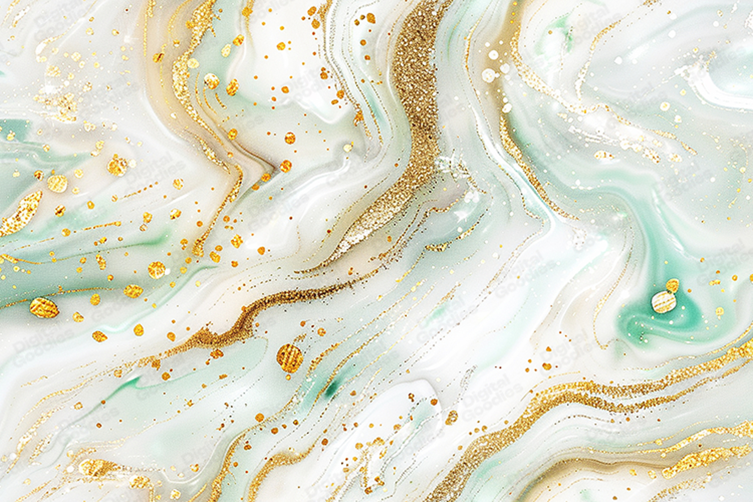 A luxurious gold and mint marble background featuring flowing fluid patterns, shimmering glitter accents, and soft pastel tones. This elegant abstract texture is perfect for high-end branding, invitations, stationery, product packaging, digital wallpapers, scrapbooking, and creative design projects. The combination of metallic gold details and smooth marble swirls creates a premium, modern, and visually stunning aesthetic suitable for any stylish artwork.
