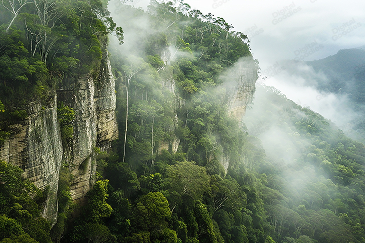 Lush green mountain forest landscape with soft mist and dramatic natural cliffs, creating a calm and atmospheric background. Perfect for nature-themed designs, digital papers, wallpapers, posters, presentations, and print projects. This high-quality scenic image brings a peaceful, fresh, and organic feel, ideal for creative work related to nature, travel, environment, and outdoor-inspired designs.