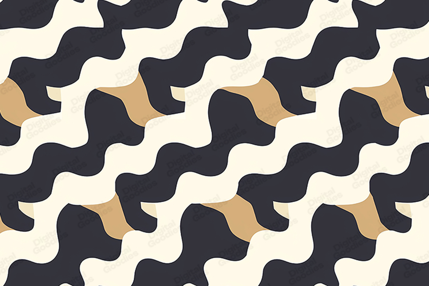 A high-resolution, contemporary abstract background featuring a bold, graphic pattern of large, interlocking wavy shapes. The design uses a sophisticated color palette of deep black/navy, warm tan/gold, and off-white/cream, creating a modern, stylized camouflage or organic wave effect. The clean lines and minimal colors make it highly versatile.