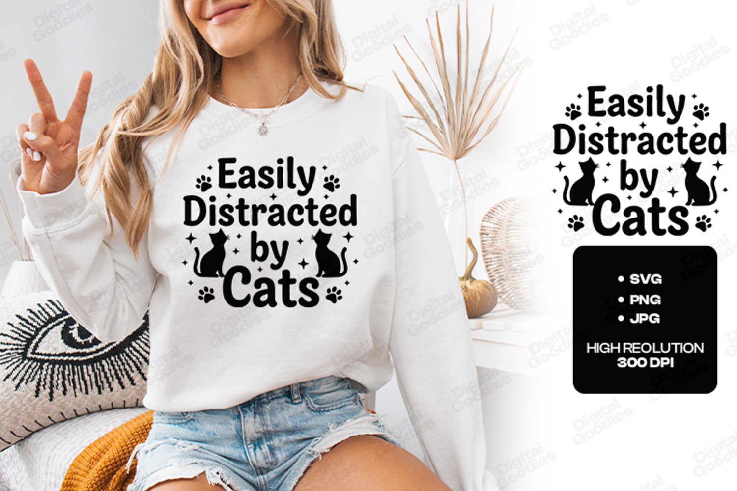 Show off your playful personality with this "Easily Distracted by Cats" SVG design! Featuring adorable cat silhouettes, paw prints, and whimsical stars, this layout is perfect for the cat lover who can't help but stop for every kitty they see.