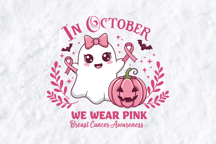 Add a touch of "spooky cute" to your advocacy with this "In October We Wear Pink" digital design! Featuring an adorable ghost wearing a pink bow and holding awareness ribbons alongside a pink jack-o'-lantern, this artwork is perfect for Halloween-themed awareness events. It’s an ideal choice for creating custom apparel, trick-or-treat bags, and festive gifts for survivors and supporters.