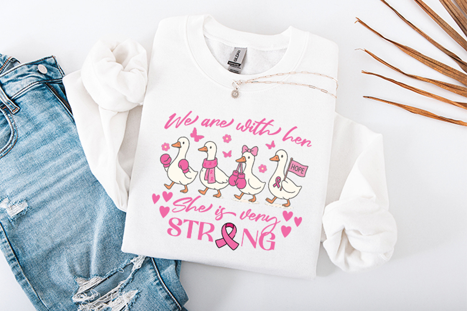 Show your support for the strong women in your life with this "We Are With Her - She Is Very Strong" digital design! This adorable illustration features four white ducks marching together, accessorized with pink boxing gloves, scarves, bows, and a "HOPE" flag. It is an ideal choice for creating group apparel, fundraising gear, or supportive gifts for fighters and survivors during Breast Cancer Awareness Month.