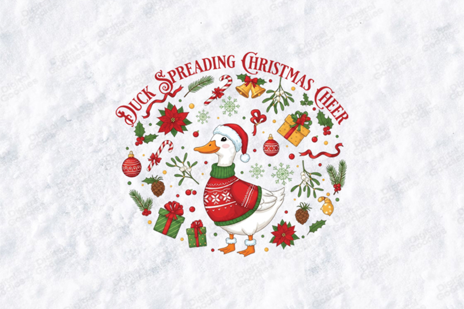This festive and charming Duck Spreading Christmas Cheer design is a delightful addition to your holiday collection! The graphic features an adorable duck wearing a Santa hat and a cozy red "ugly" Christmas sweater, positioned in the center of a beautiful circular wreath design. The wreath is filled with classic holiday elements like pine sprigs, candy canes, mistletoe, poinsettias, bells, and gifts. The text reads: "DUCK SPREADING CHRISTMAS CHEER."