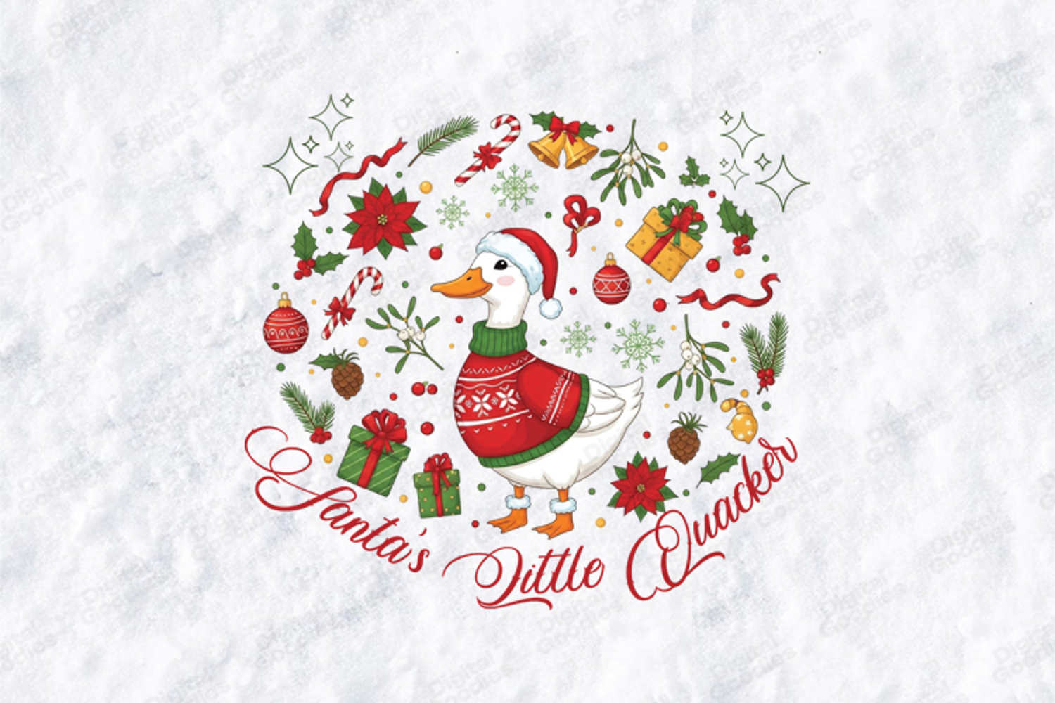 This festive and adorable Santa's Little Quacker design is a charming addition to your holiday offerings! The graphic features a sweet duck wearing a Santa hat and a cozy red "ugly" Christmas sweater, centrally positioned among a scattering of classic Christmas elements like candy canes, poinsettias, mistletoe, bells, and gifts. The whimsical text reads: "Santa's Little Quacker" in a lovely cursive font around the bottom edge.