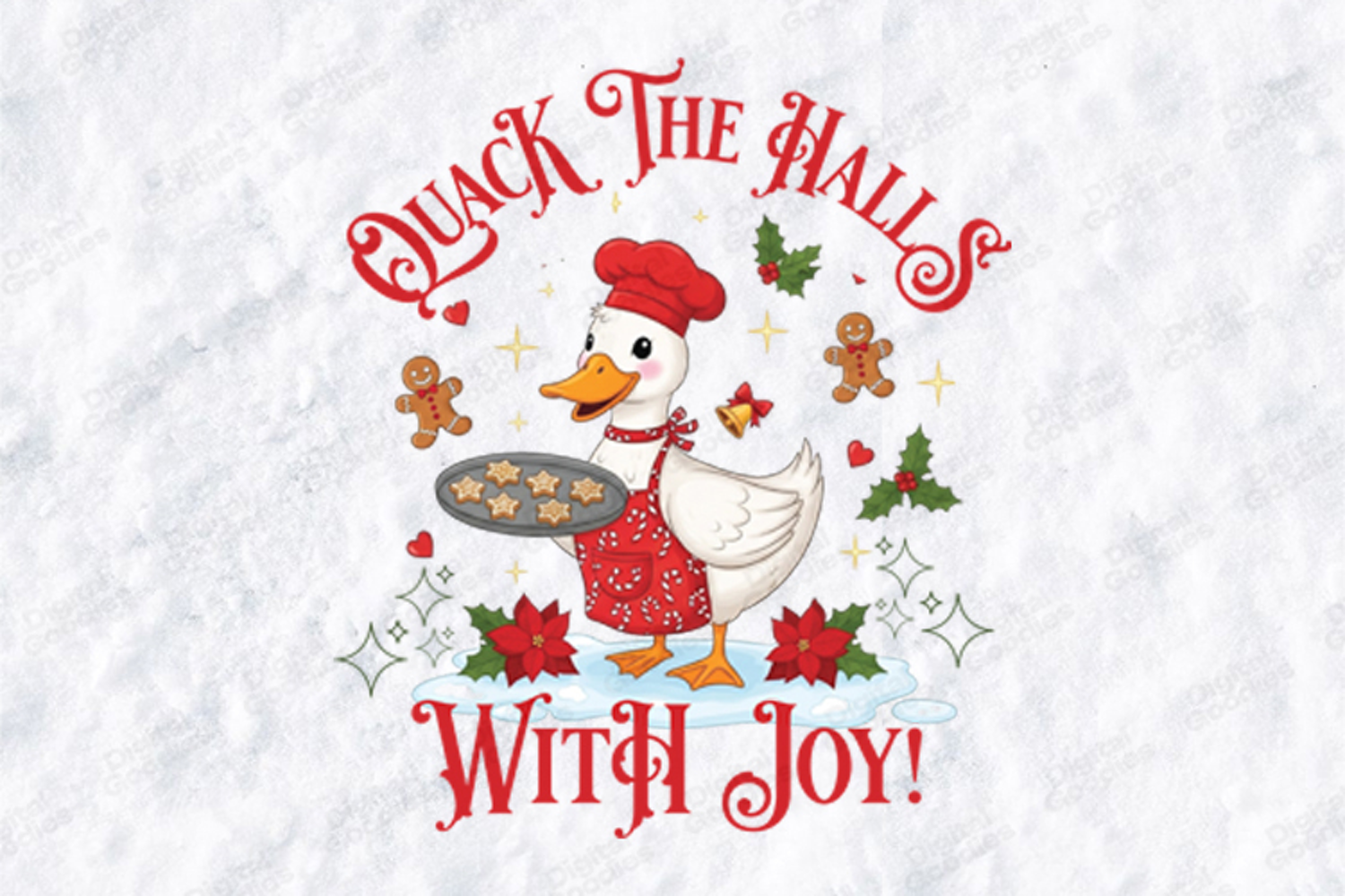 This charming and punny Chef Duck Christmas SVG is perfect for spreading holiday cheer in the kitchen and beyond! The graphic features an adorable duck wearing a chef's hat and apron, proudly presenting a tray of freshly baked star-shaped cookies. The scene is decorated with festive gingerbread men, holly, and poinsettias. The clever text reads: "QUACK THE HALLS WITH JOY!"