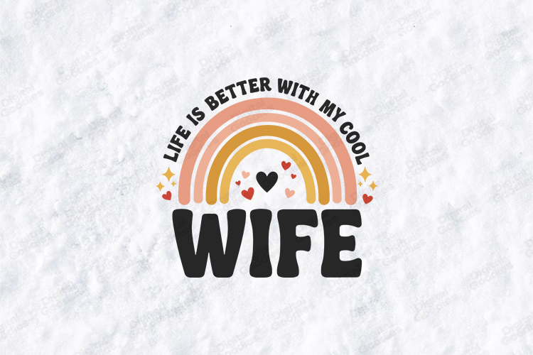 Celebrate your partnership with this "Life is Better With My Cool Wife" digital design. This trendy artwork features a boho-inspired retro rainbow in warm earthy tones, accented by a central black heart and fluttering red hearts. With its bold, vintage-style typography and high-quality finish, it is the perfect choice for creating professional-quality apparel, anniversary gifts, or heartwarming home decor.