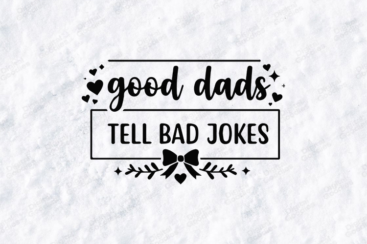 Celebrate the classic humor of fatherhood with this "Good Dads Tell Bad Jokes" digital design. This trendy graphic features a playful mix of elegant script and clean sans-serif typography enclosed in a modern rectangular frame. Adorned with a signature bow accent, botanical flourishes, and charming heart elements, it is the perfect choice for creating professional-quality apparel, mugs, or humorous gifts for the dad who loves a good pun.