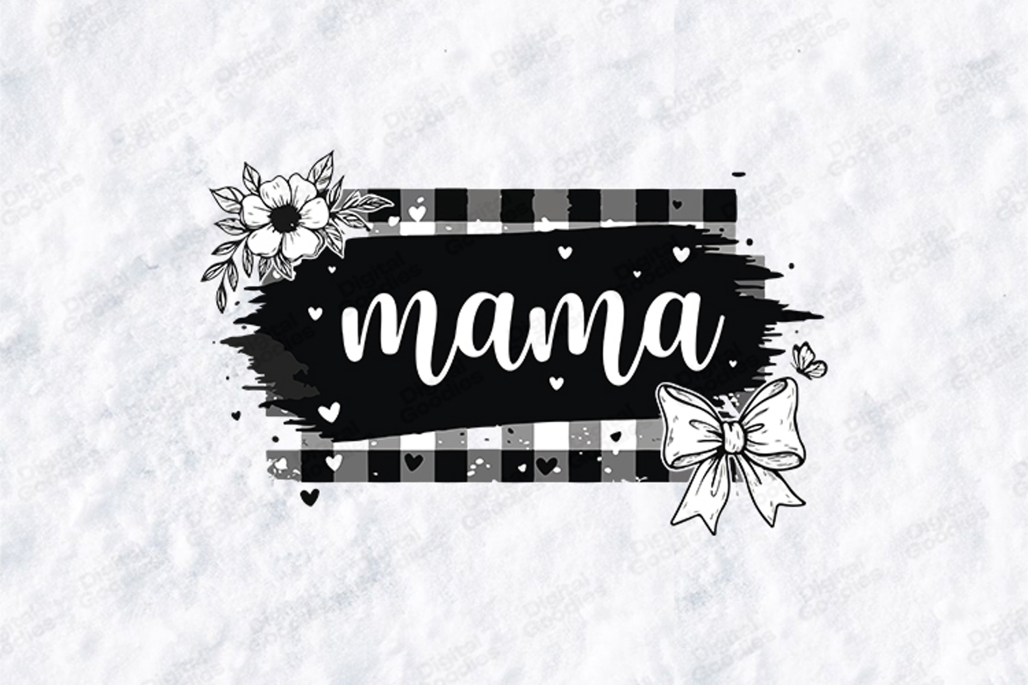 Celebrate motherhood with this stylish "Mama" digital design that blends classic patterns with modern trends. This intricate artwork features "mama" in a graceful white script set against a bold black paint-stroke background. The design is framed by a rustic checkered border and accented with a beautiful hand-drawn floral cluster, a delicate coquette bow, and whimsical floating hearts. It is the perfect choice for creating professional-quality apparel, tote bags, or heartfelt gifts for any trendy mama.