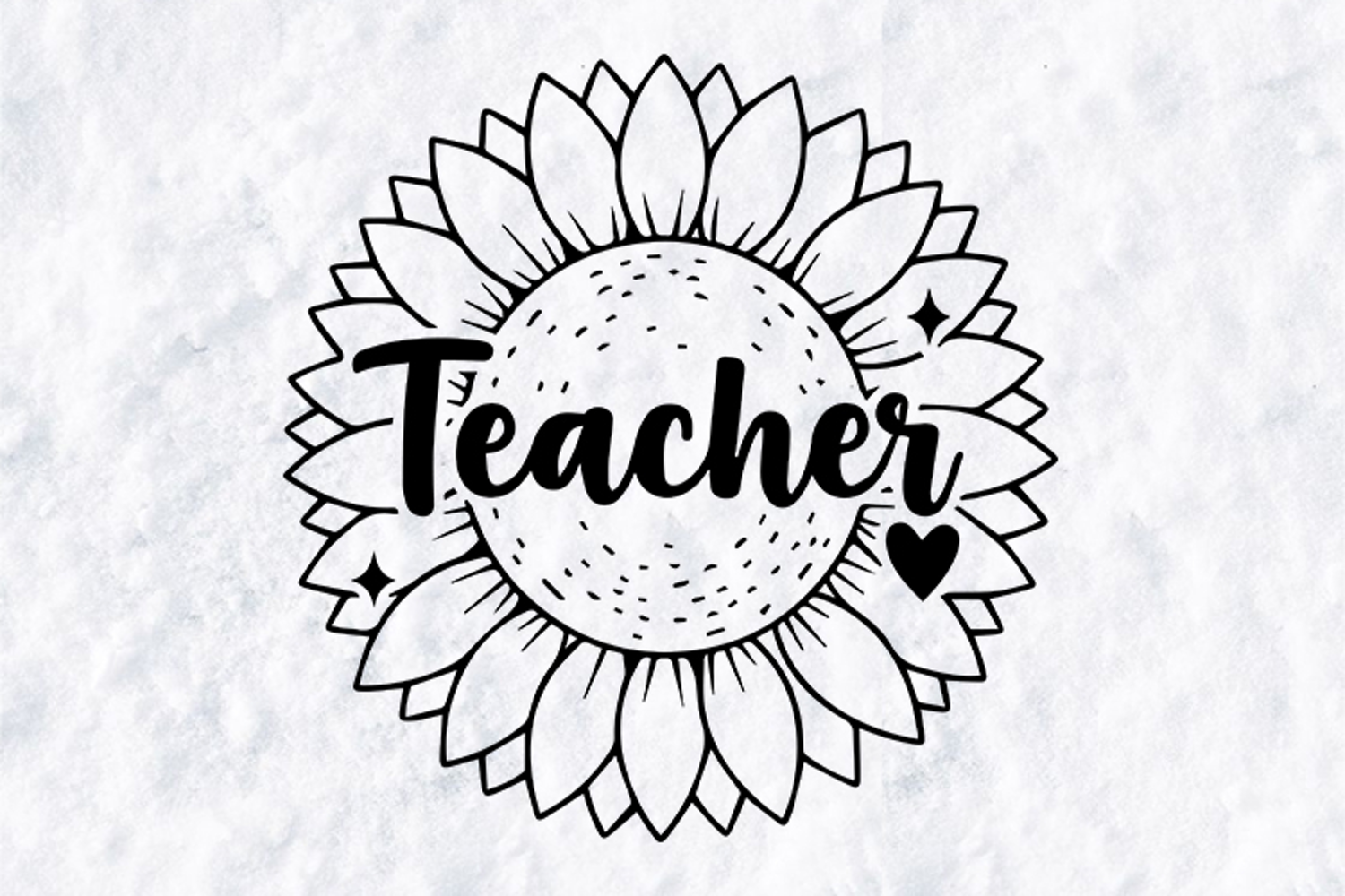 Celebrate the hard work of educators with this charming "Teacher" Sunflower digital design. This elegant artwork features a beautifully detailed, hand-drawn sunflower bloom with "Teacher" written in a bold, modern script across the textured center. Accented with a delicate heart and whimsical sparkles within the petals, it is the perfect choice for creating professional-quality apparel, tote bags, or heartfelt appreciation gifts for your favorite educator.