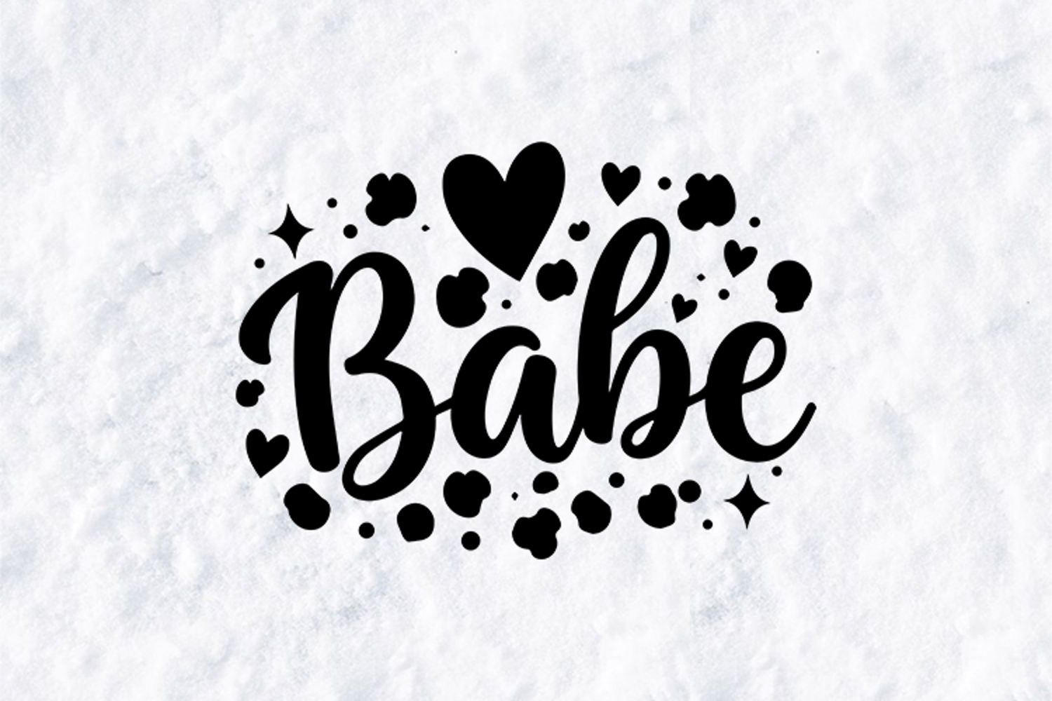 Embrace the western trend with this stylish "Babe" digital design. This artwork features "Babe" in a graceful, modern script surrounded by a playful cow print pattern and various-sized hearts. Accented with minimalist stars and whimsical flourishes, it is the perfect choice for creating professional-quality apparel, accessories, or fashionable gifts for any trendy babe.