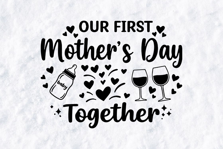 This high-quality digital illustration features a playful and sentimental aesthetic, perfect for honoring a mother's very first holiday milestone with her child. The design showcases the phrase "OUR FIRST Mother's Day Together" in a friendly combination of bold sans-serif and whimsical script lettering. It is creatively accented with a cute baby bottle labeled "baby" and two elegant wine glasses, symbolizing a well-deserved celebratory moment for the new parent. Surrounded by a shower of small solid hearts and twinkling sparkles, this high-contrast monochrome artwork is an ideal choice for creating professional t-shirts, personalized wine labels, and memorable keepsakes.