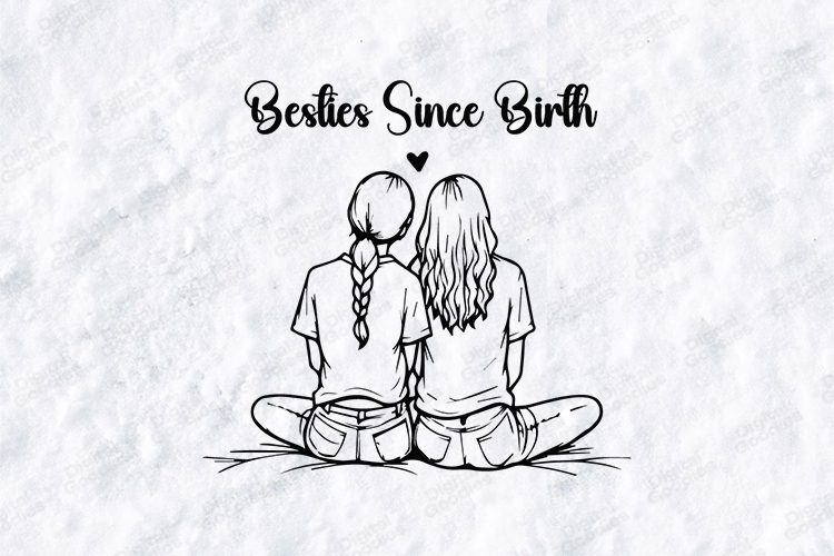 Sweet and minimalist "Besties Since Birth" line art illustration featuring two lifelong best friends sitting side-by-side with a small heart detail. This clean, modern hand-drawn design is perfect for celebrating childhood friendships, creating personalized bff birthday gifts, or matching sisterhood sweatshirts. Ideal for Cricut crafting, sublimation printing, and digital memory books, this aesthetic friendship graphic adds a sentimental and stylish touch to any creative project.