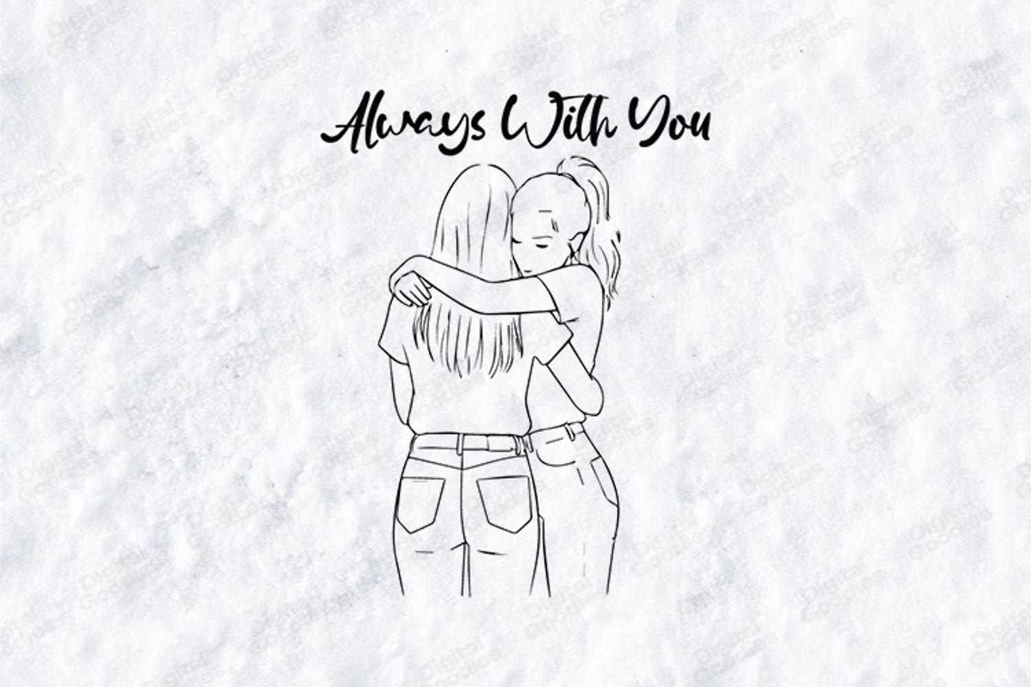 Comforting and minimalist "Always With You" line art illustration featuring two best friends sharing a supportive hug. This clean, modern hand-drawn design is perfect for celebrating sisterhood, creating meaningful long-distance friendship gifts, or designing sentimental matching apparel. Ideal for Cricut crafting, sublimation printing, and digital greeting cards, this aesthetic line art graphic adds a heartfelt and stylish touch to any creative project.