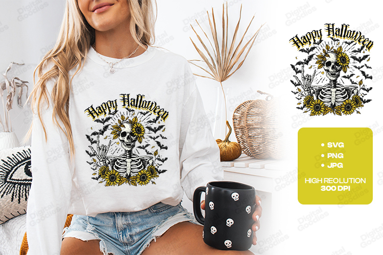 This high-quality digital illustration features a unique and vibrant aesthetic, perfect for those who love a mix of gothic imagery and cheerful sunflowers. The design showcases a detailed human skeleton making a "rock on" hand sign, with bright yellow sunflowers adorning its head and base. The central figure is surrounded by a dense cloud of fluttering black bats and delicate botanical leaves. The phrase "Happy Halloween" arches across the top in a bold, yellow-and-black gothic font that captures the energetic spirit of the holiday. This high-impact artwork is an ideal choice for creating professional Halloween t-shirts, personalized party decor, and trendy seasonal home accents.