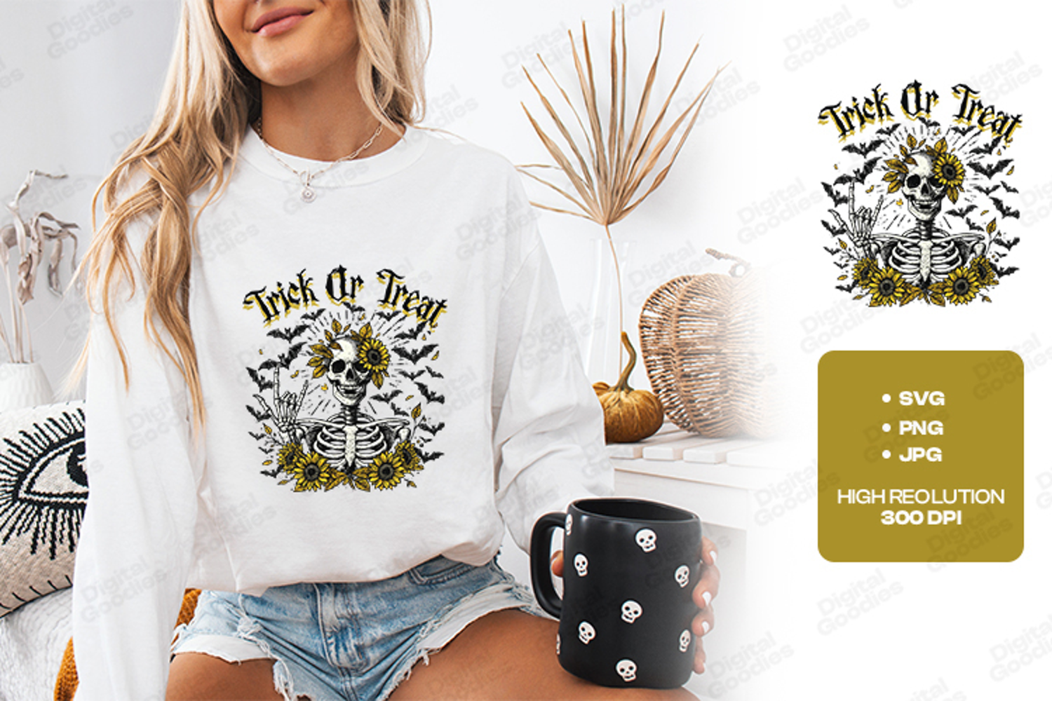 This high-quality digital illustration features a vibrant and edgy aesthetic, perfect for those who love a stylish twist on traditional holiday imagery. The design showcases a detailed human skeleton making a "rock on" hand sign, with bright yellow sunflowers adorning its head and base. The central figure is surrounded by an energetic swarm of fluttering black bats and delicate botanical leaves. Arched across the top, the phrase "Trick Or Treat" is rendered in a bold, yellow-and-black gothic font that perfectly captures the fun and rebellious spirit of Halloween. This high-impact artwork is an ideal choice for creating professional t-shirts, personalized trick-or-treat bags, and trendy seasonal home decor.