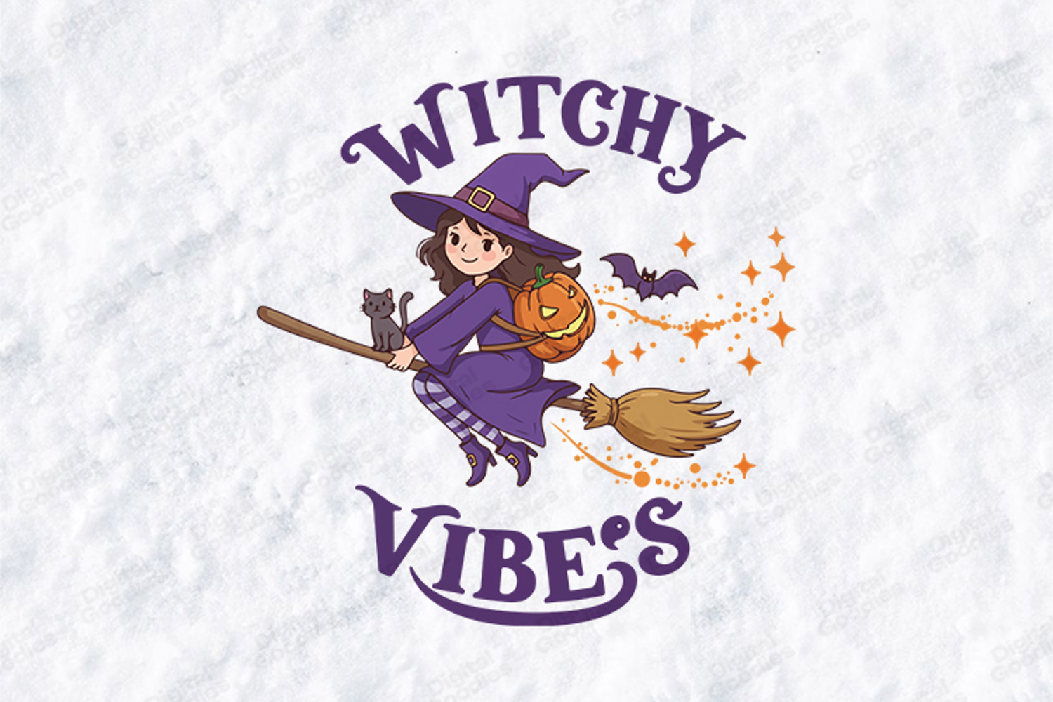 Soar through the moonlight with this enchanting "Witchy Vibes" design featuring a charming young witch on a magical journey. The high-quality illustration showcases a witch in a purple outfit and striped stockings flying her broomstick with a black cat and a carved pumpkin backpack. Ideal for professional Halloween apparel, whimsical stationary, and magical home decor using the included high-resolution SVG, PNG, and JPG files.