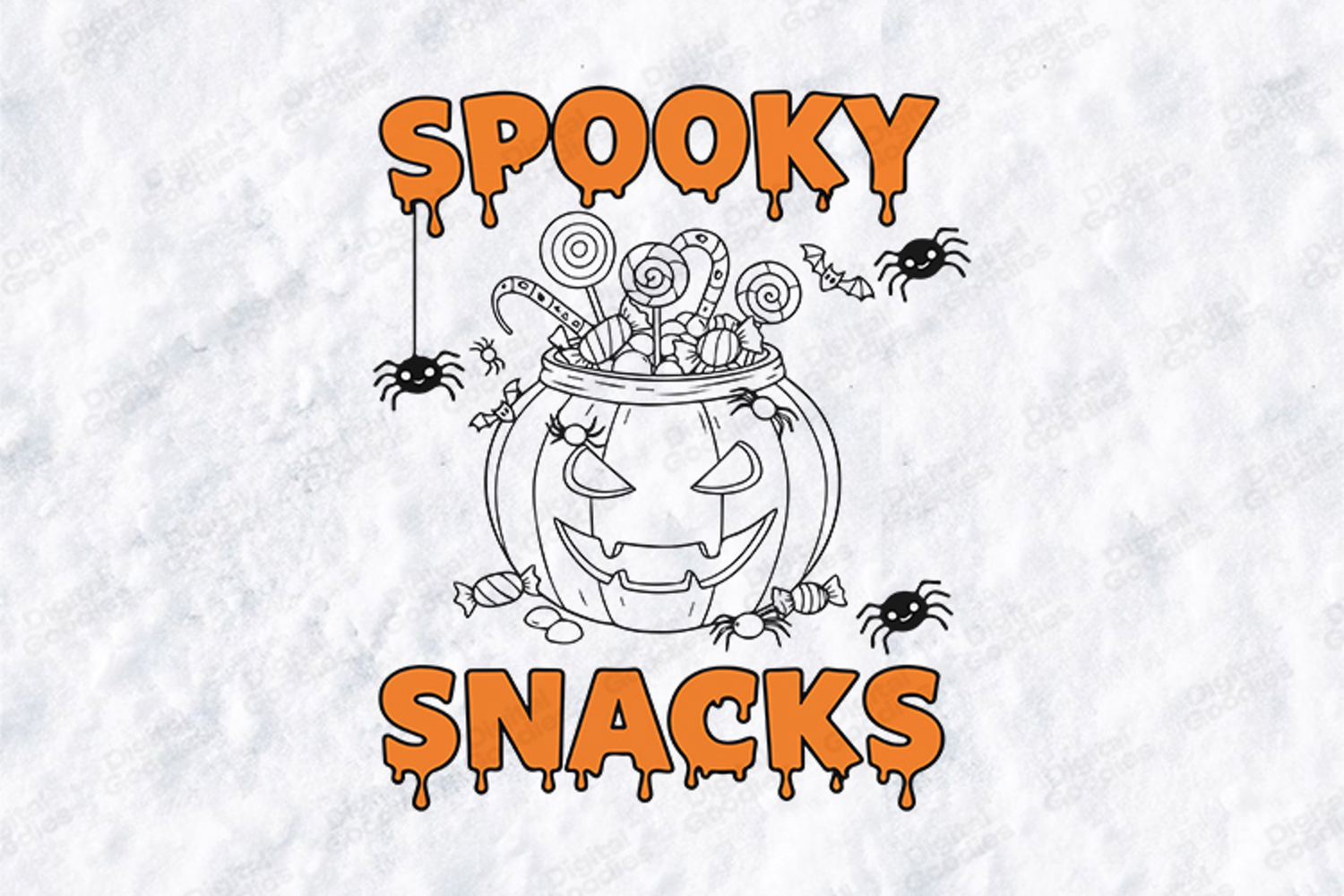 Satisfy your holiday cravings with this delicious "Spooky Snacks" pumpkin candy design. This high-quality digital illustration features a line-art Jack-o'-lantern overflowing with lollipops and assorted treats, surrounded by playful spiders and fluttering bats. Perfect for creating professional holiday t-shirts, festive party favors, and whimsical kitchen decor with the included high-resolution SVG, PNG, and JPG files.