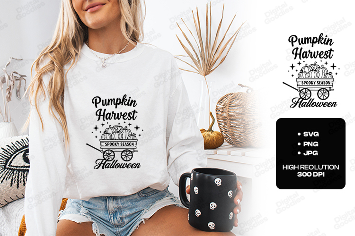 Celebrate the bounty of the season with the rustic "Pumpkin Harvest Halloween" design. This high-quality digital illustration features a traditional wooden cart overflowing with a variety of pumpkins and gourds, surrounded by twinkling stars. Perfect for creating professional holiday t-shirts, farmhouse-style home decor, and festive seasonal greeting cards with the included high-resolution SVG, PNG, and JPG files.
