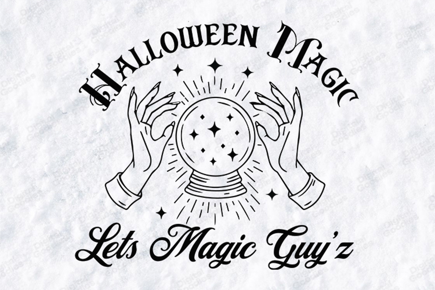 Predict a season of fun with the enchanting "Halloween Magic Lets Magic Guy’z" design. This high-quality digital illustration features a pair of mystical hands hovering over a glowing crystal ball filled with stars, accented by radiant light beams and a playful typographic message. Ideal for creating professional holiday t-shirts, mystical party invitations, and modern gothic home decor with the included high-resolution SVG, PNG, and JPG files.