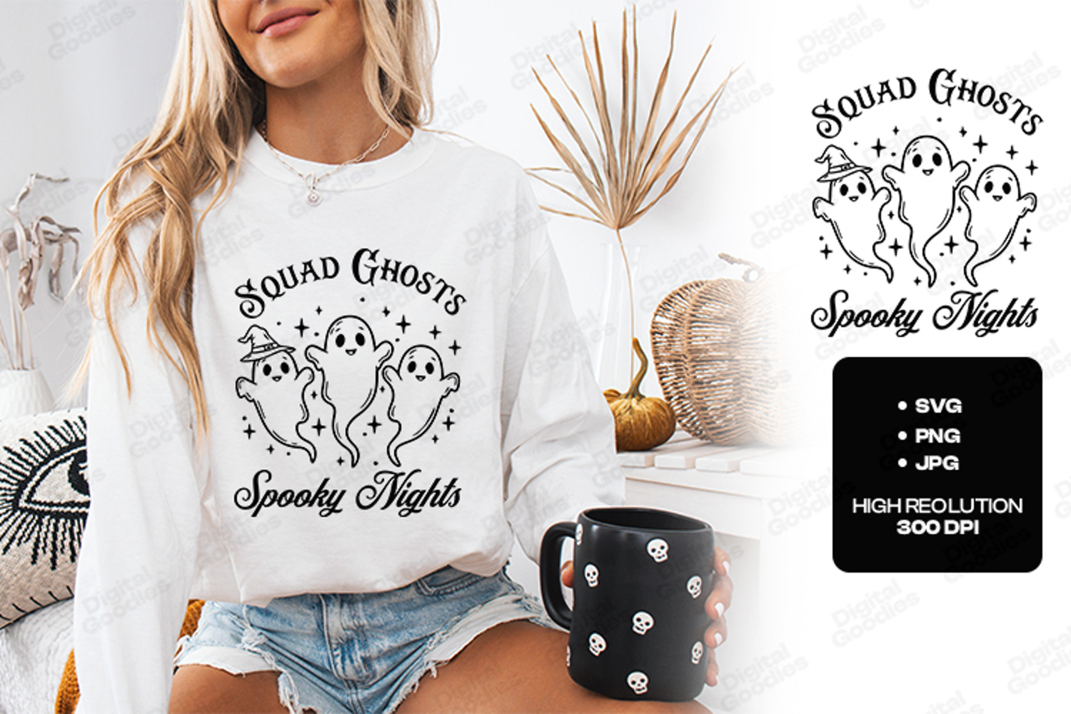 Gather your spectral crew for a night of fun with the "Squad Ghosts Spooky Nights" design. This high-quality digital illustration features a trio of friendly, waving ghosts—one sporting a small witch hat—surrounded by a field of twinkling stars. Perfect for creating professional "Squad Goals" Halloween t-shirts, festive party favors, and whimsical seasonal home decor with the included high-resolution SVG, PNG, and JPG files.