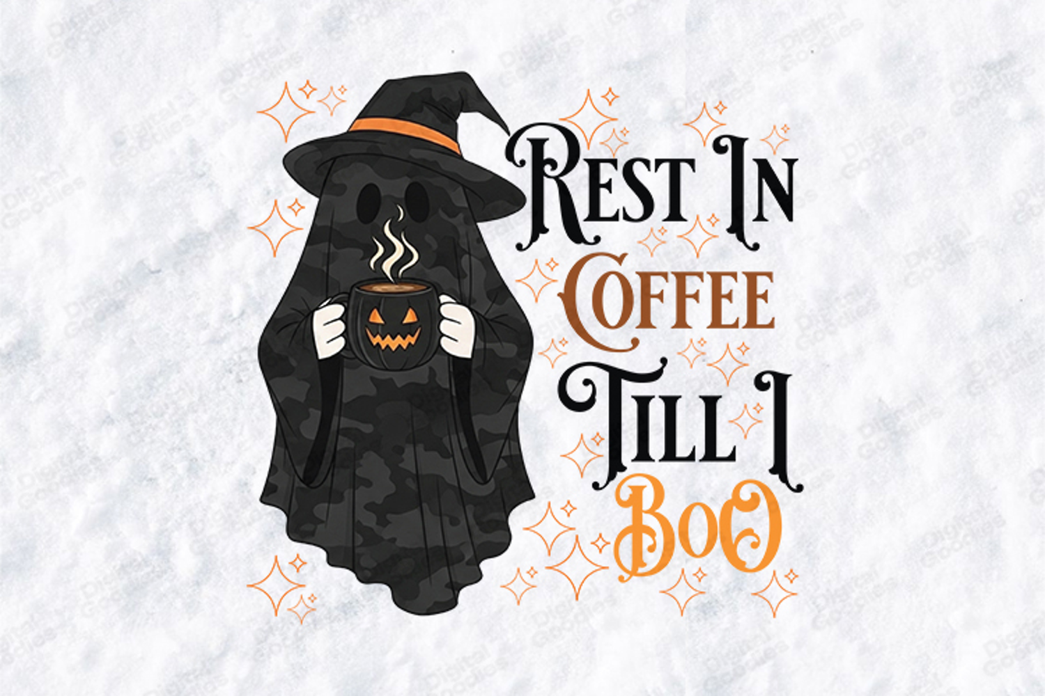 This high-quality digital illustration features a charming ghost in a dark camouflage pattern, complete with a classic orange-banded witch hat. Holding a steaming pumpkin-face coffee mug and surrounded by shimmering orange sparkles, this design is the ultimate choice for coffee-loving crafters who embrace the "Witchy Aesthetic."