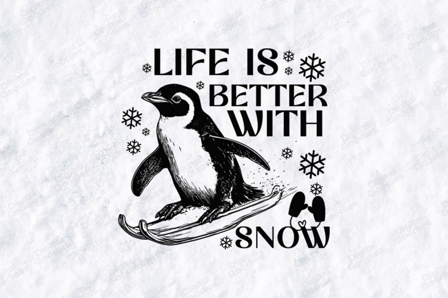 Celebrate the joy of the slopes with the adorable "Life Is Better With Snow" penguin design. This high-quality digital illustration features a detailed penguin gliding on skis, framed by festive snowflakes and a pair of cozy mittens. Combined with elegant, multi-font typography, this design is perfect for creating professional winter apparel, seasonal decals, and whimsical holiday cards with the included high-resolution files.