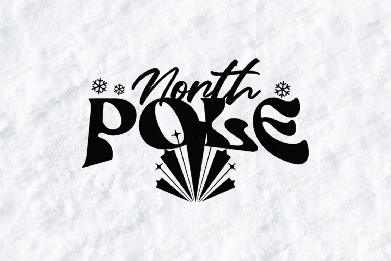 Capture the spirit of the festive season with the stylish "North Pole" typography design. This high-quality digital illustration features a modern, playful font with "North" in an elegant script and "POLE" in a bold, wavy typeface. Accented with delicate snowflakes and a radiant, starburst-style graphic, this design is perfect for creating professional holiday t-shirts, festive home decor, and winter-themed decals with the included high-resolution files.