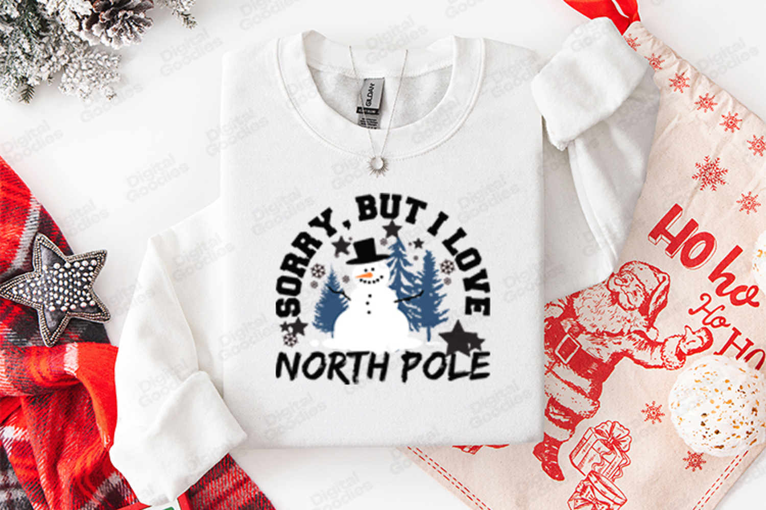 Embrace the chilly charm of the arctic with this "Sorry, But I Love North Pole" digital design. Featuring a cheerful snowman nestled among evergreen trees and twinkling stars, this high-quality vector is perfect for capturing the spirit of a winter wonderland.