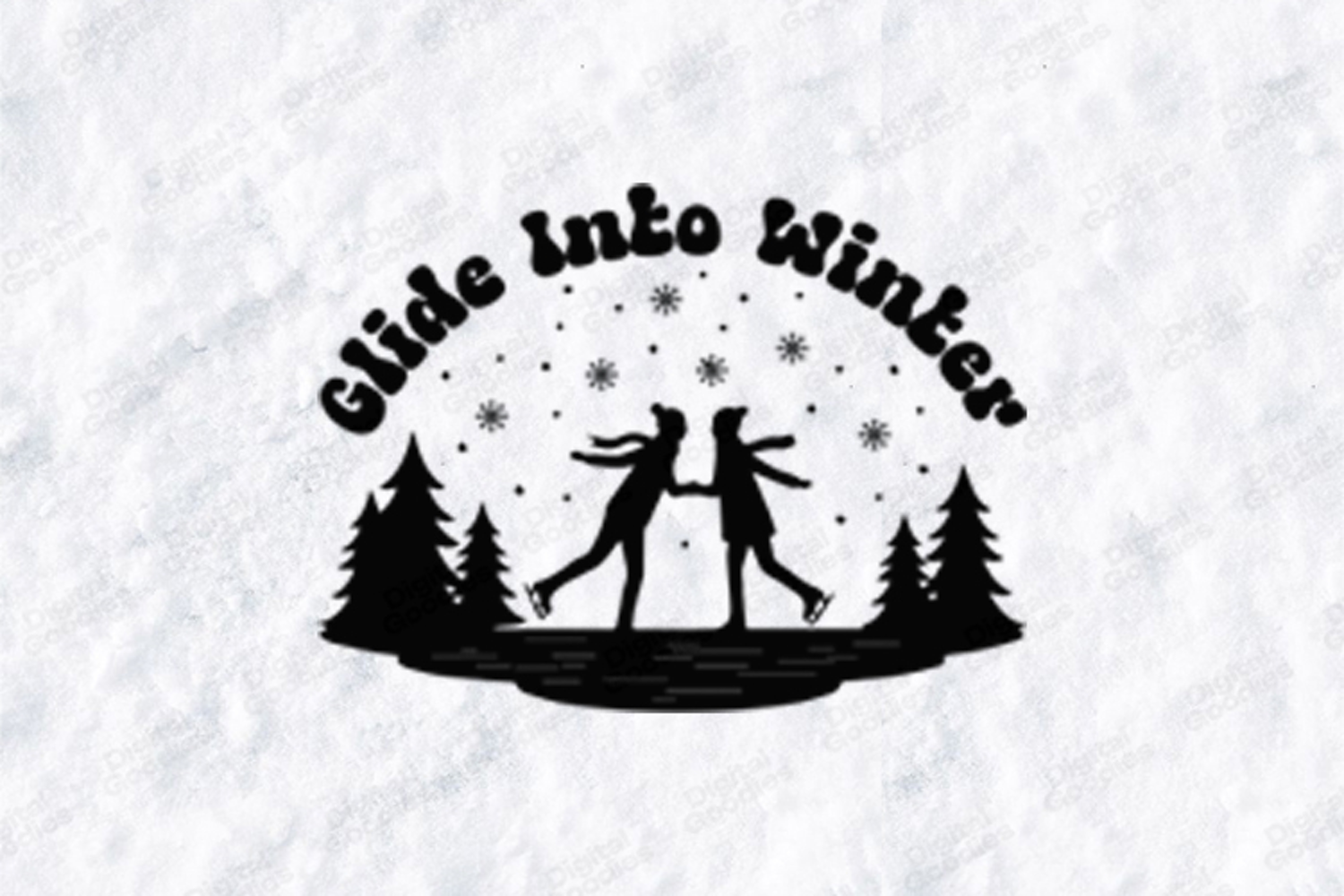 Embrace the smooth beauty of the season with the "Glide Into Winter" digital design. This captivating graphic features a retro-inspired silhouette of a couple ice skating, framed by majestic evergreen trees and a sky filled with delicate snowflakes. With its groovy, wavy typography and clean black-and-white aesthetic, this design is a perfect blend of vintage charm and modern winter style.