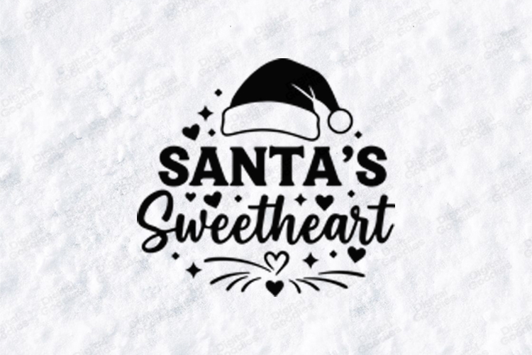 Spread the holiday cheer with this adorable "Santa’s Sweetheart" digital design. This festive graphic features charming typography paired with a classic Santa hat, surrounded by sweet heart and star accents. It is the perfect choice for creating high-quality children’s apparel, holiday gifts, or personalized winter decor.