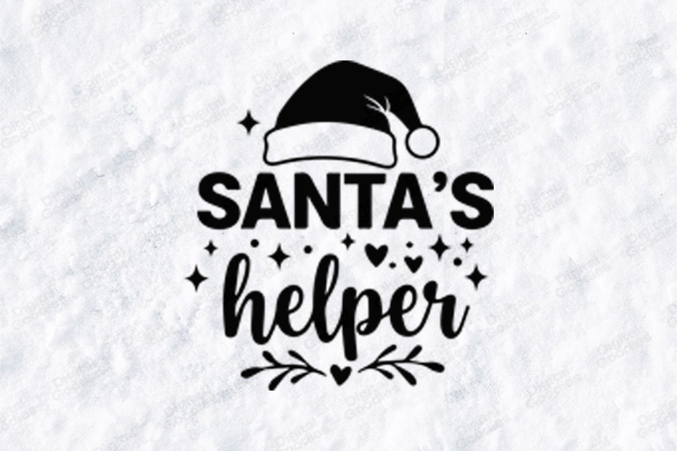 Get ready for the workshop with this playful "Santa’s Helper" digital design. This high-quality graphic features bold, hand-lettered style typography topped with a classic Santa hat and accented with whimsical hearts, stars, and flourish details. It is the perfect choice for creating adorable holiday apparel for the little helpers in your life.