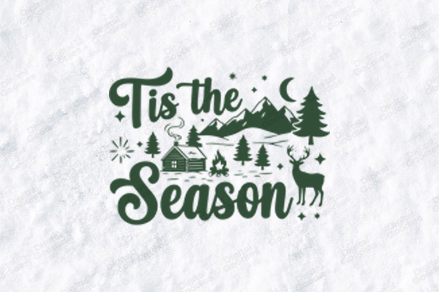 This beautifully detailed illustration captures the essence of a peaceful winter night in the mountains. Featuring a rustic log cabin, a crackling campfire, towering pine trees, and a majestic deer under a crescent moon, this design is perfect for those who love the great outdoors. It is expertly crafted for clean cutting and high-quality printing, making it a must-have for your holiday crafting library.