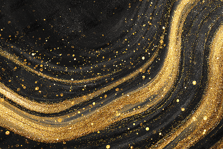 This high-resolution digital background features a sophisticated, high-glamour aesthetic. The composition showcases a dynamic fluid design with deep charcoal and black marbleized swirls, heavily accented by thick, flowing ribbons of brilliant metallic gold. The piece is detailed with a dense spray of gold stardust and shimmering glitter particles that follow the movement of the liquid curves, creating a luminous, multi-dimensional effect. Perfect for professional holiday branding, upscale event stationery, dramatic website headers, and premium digital scrapbooking. This polished and artistic composition provides a high-fashion look for sublimation printing and luxury seasonal marketing.
