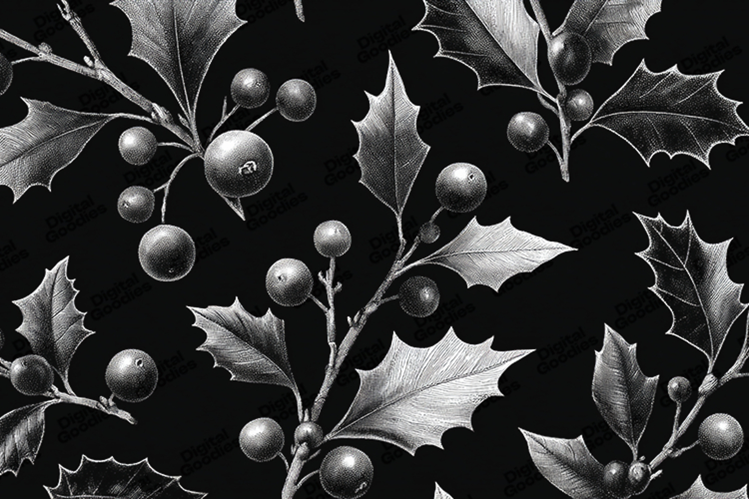Festive Sublimation Art Nordic Holiday Decor Minimalist Holiday Paper Stippled Botanical Art Hand-drawn Holly Leaves Chic Monochrome Botanical High-resolution Winter Pattern White Holly Pattern Black Winter Background Modern Christmas Greenery