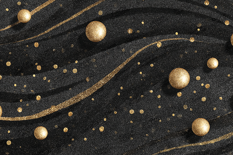 This high-resolution digital background features a sophisticated, flowing black silk wave texture accented by radiant gold dust and shimmering metallic spheres. The elegant golden trails and scattered glitter particles create a sense of movement and luxury against the deep, textured dark backdrop. Perfect for high-end corporate holiday cards, luxury New Year’s Eve invitations, premium seasonal branding, and sophisticated digital scrapbooking. This modern black and gold aesthetic provides a professional, upscale look for sublimation printing and contemporary festive decor.