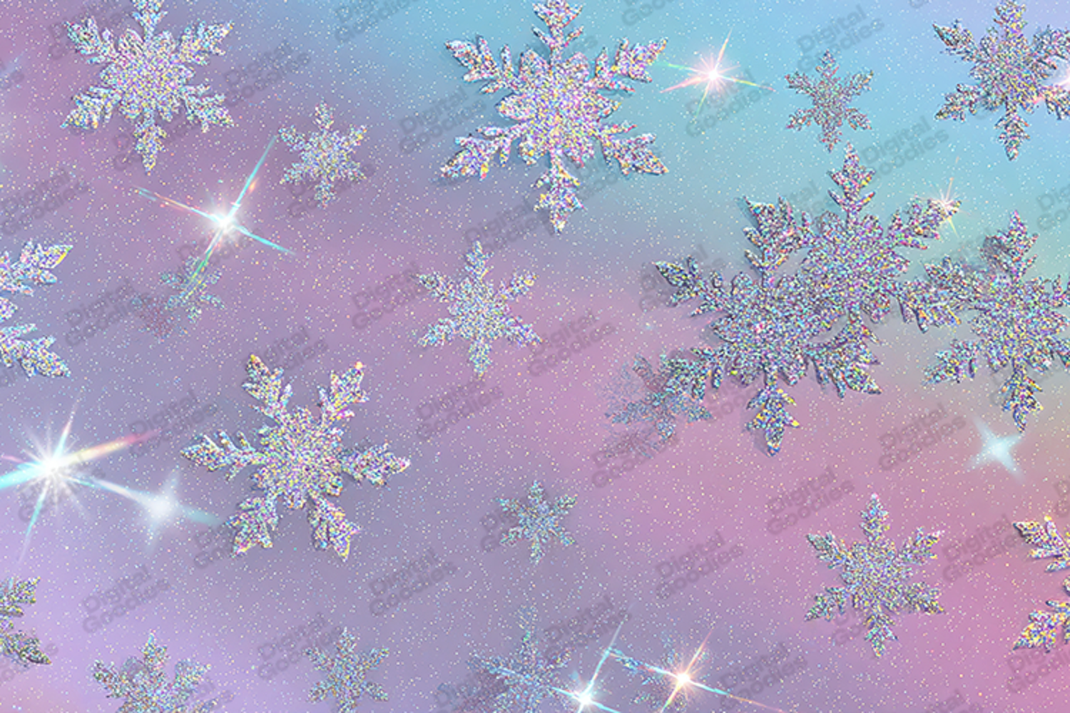 This high-resolution digital background features a dreamy array of large, shimmering snowflakes crafted from dense iridescent glitter. The crystal shapes are set against a soft, ethereal pastel gradient transitioning through hues of lilac, mint, and sky blue. Radiant starbursts and prismatic light flares are scattered throughout the scene, adding a sense of magic and movement. Perfect for whimsical "Winter Wonderland" party invitations, trendy seasonal branding, magical holiday greeting cards, and colorful digital scrapbooking. The combination of glowing holographic textures and soft rainbow tones provides a professional, contemporary look for sublimation printing and modern festive decor.