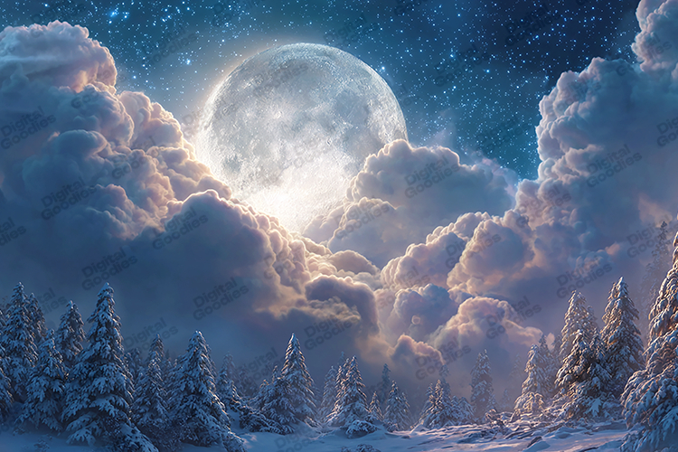 This high-resolution digital background features a breathtaking, ethereal winter night. The composition showcases a massive, brilliant full moon partially nestled behind towering, dramatic clouds that glow with reflected light. Below, a dense forest of snow-covered pine trees sits at the base of rugged mountains under a vast, starry sky. Perfect for atmospheric holiday greeting cards, dreamy seasonal branding, celestial-themed website headers, and premium digital scrapbooking. This expansive and luminous landscape provides a sophisticated, high-end look for sublimation printing and professional seasonal marketing.