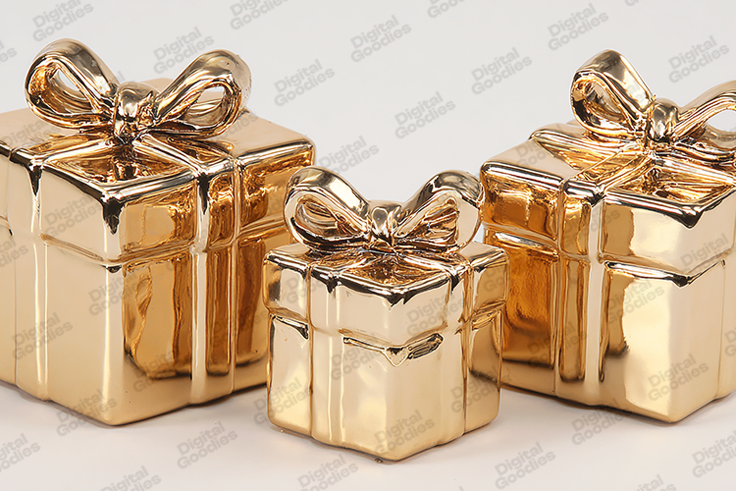 Elegant Christmas Art High-resolution Scenery Gold Christmas Gifts Metallic Gift Boxes Luxury Holiday Decor Gold Ceramic Presents Festive White Background Gold Ribbon Gift Minimalist Holiday Paper Sophisticated Gift Art