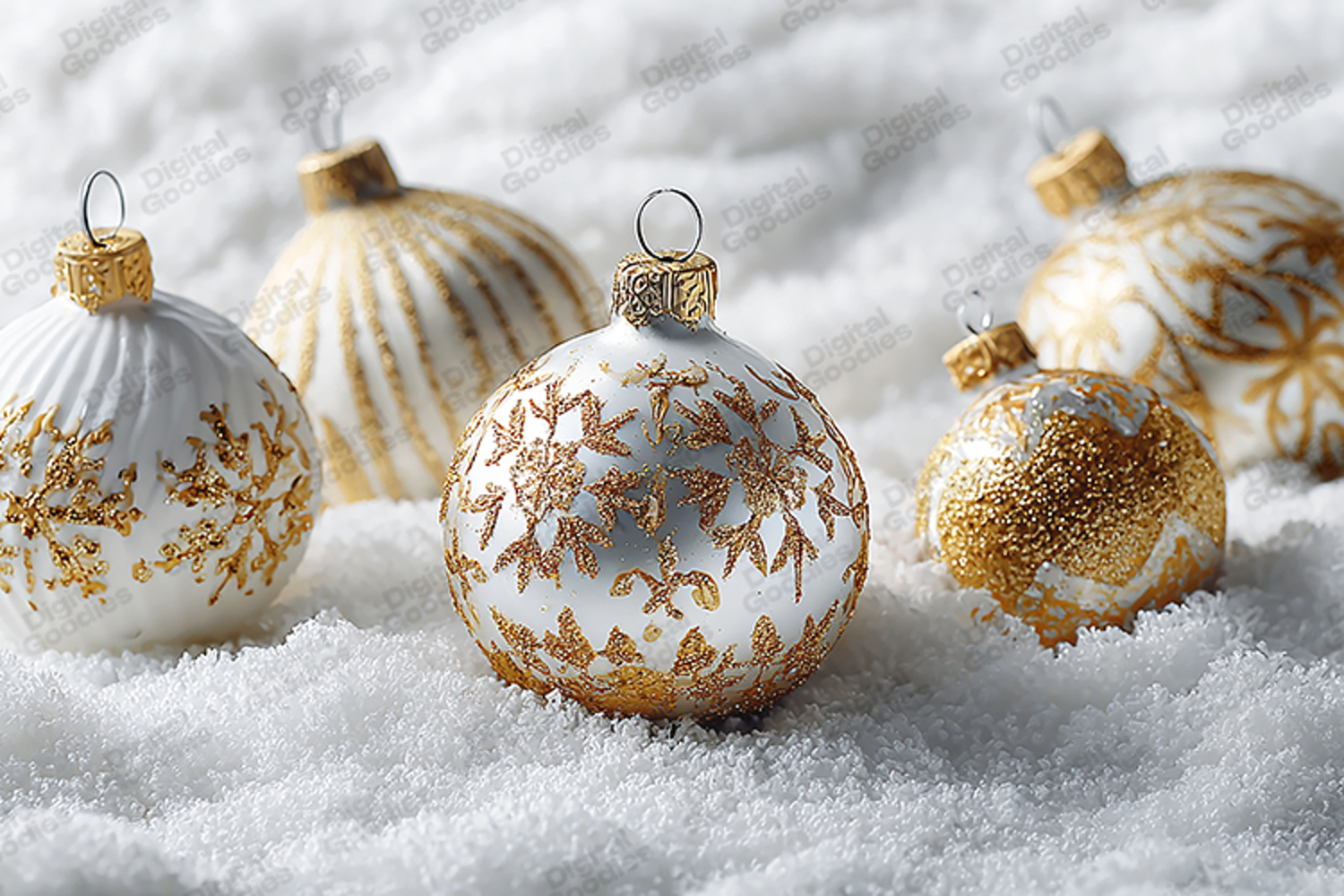 This high-resolution digital background features a sophisticated, classic luxury holiday aesthetic. The design showcases a collection of five exquisite ceramic baubles—featuring matte white finishes with intricate gold glitter snowflakes and elegant vertical gold stripes—arranged naturally in a deep bed of soft white snow. The bright, airy composition is perfect for premium holiday greeting cards, professional seasonal branding, upscale retail marketing, and luxury digital scrapbooking. This refined, high-contrast gold-on-white art provides a polished, professional look for sublimation printing and high-end festive displays.
