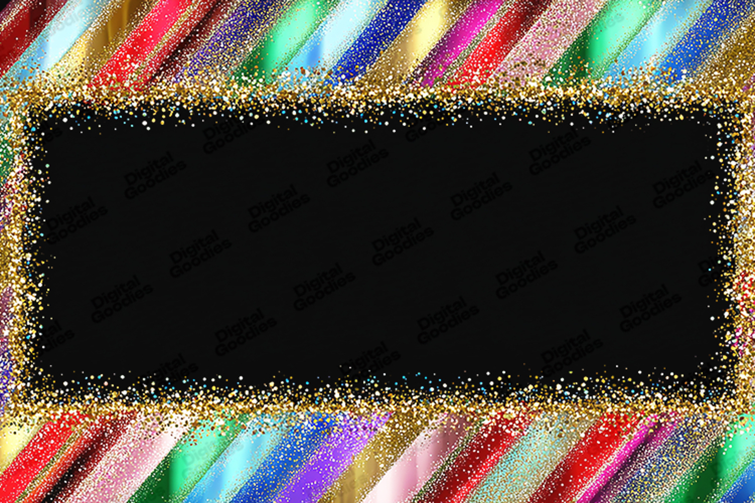 This high-resolution digital frame features a high-energy border of diagonal metallic tinsel strands in a vibrant rainbow of red, green, blue, pink, and gold. The inner edge is defined by a thick, sparkling frame of golden glitter, surrounding a solid black central rectangular space for your custom message or photo. This landscape-oriented design is perfect for festive holiday party invitations, vibrant New Year’s Eve announcements, colorful seasonal marketing banners, and joyful digital scrapbooking. The sharp contrast between the radiant, multi-color metallic textures and the dark background provides a premium, high-impact look for sublimation printing and modern festive branding.