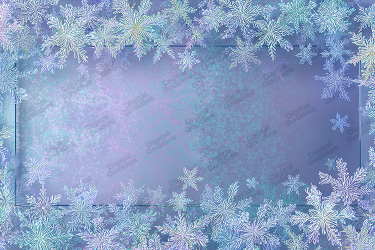This high-resolution digital background features a dreamy, ethereal winter aesthetic. The design showcases a lush, all-around frame of delicate, multi-layered snowflakes with a soft iridescent finish that reflects shades of lavender, mint, and icy blue. The central space is a soft gradient of frosted purple and teal, overlayed with a subtle texture of fine ice crystals and shimmering snow dust. Perfect for whimsical holiday greeting cards, winter-themed wedding stationery, professional seasonal branding, and magical digital scrapbooking. This light-filled, prismatic composition provides a sophisticated, modern look for sublimation printing and unique festive marketing.