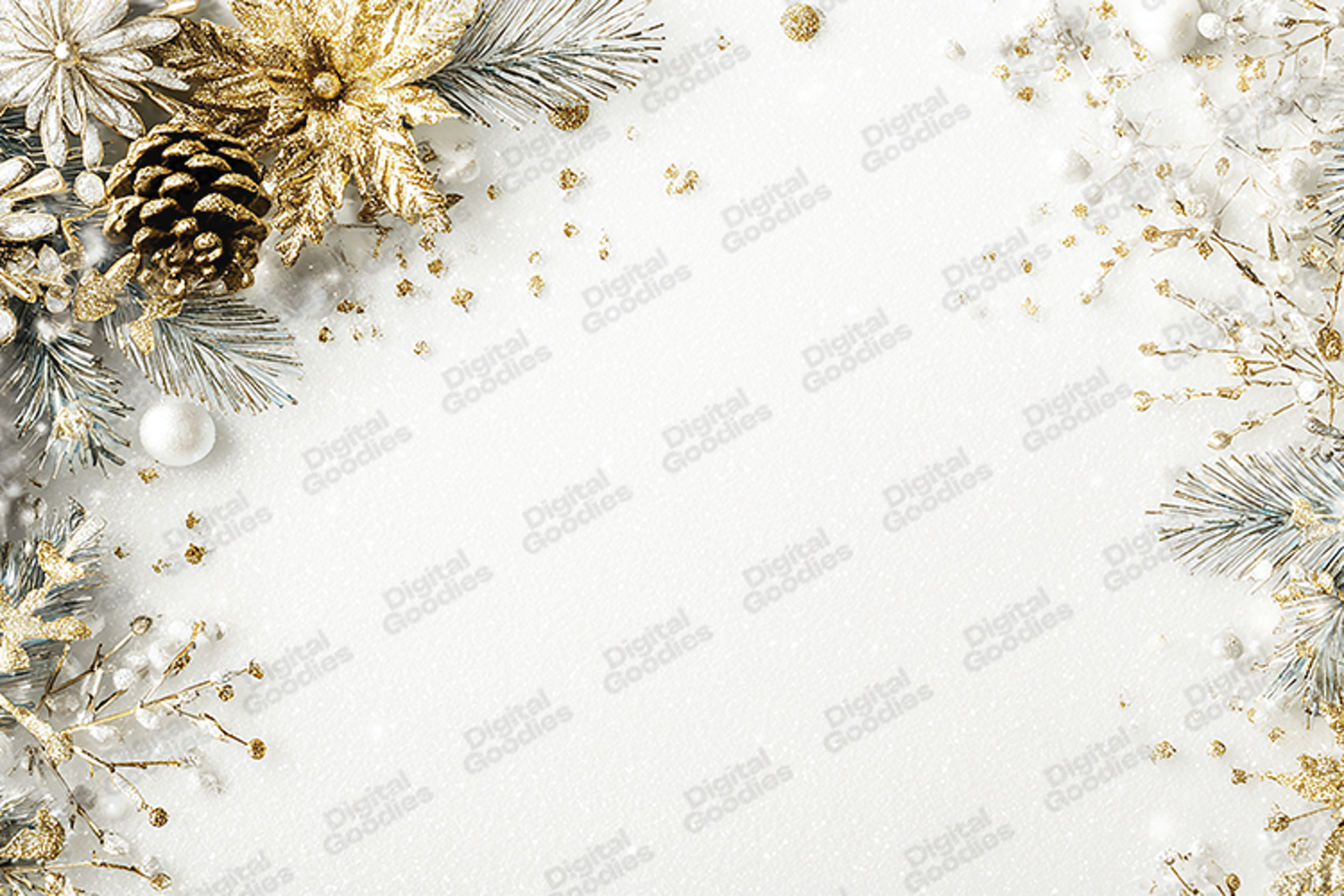 This high-resolution digital background features a sophisticated, classic holiday aesthetic. The design showcases a lush corner arrangement of metallic gold poinsettias, textured gold pine cones, and frosted evergreen branches. The frame is completed with delicate gold sprigs and white ornaments set against a shimmering white glitter-textured background. Perfect for elegant holiday greeting cards, professional winter branding, upscale event invitations, and premium digital scrapbooking. This refined botanical composition provides a timeless, luxury look for sublimation printing and high-end seasonal marketing.