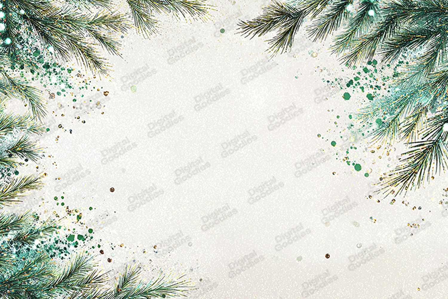 This high-resolution digital background features a celebratory and elegant winter aesthetic. The design showcases lush green pine branches in the corners, accented with shimmering gold and green glitter. Artistic splatters of emerald green, gold, and teal confetti-like glitter are scattered across a crisp, shimmering white-textured background. Perfect for festive holiday greeting cards, professional seasonal branding, cheerful winter invitations, and creative digital scrapbooking. This bright and sparkling composition provides a professional, high-energy look for sublimation printing and festive marketing.