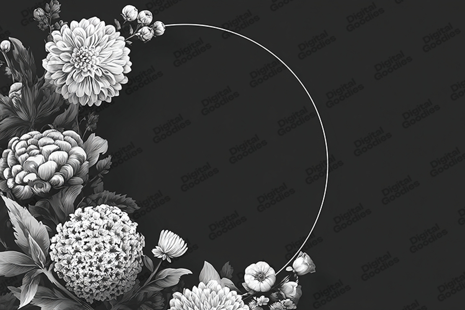 Digital Paper Sublimation Design Black And White Flowers Dahlia Frame Elegant Stationery Dark Aesthetic Minimalist Floral Art Noir Floral Frame Monochromatic Botanical Silver Circle Border
