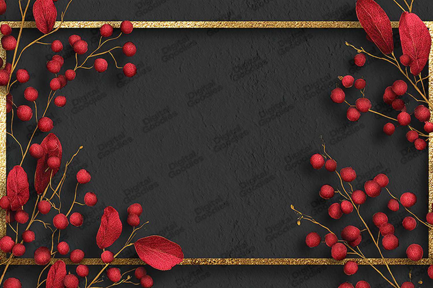 A striking and elegant holiday frame featuring vibrant red winter berries and rich crimson eucalyptus leaves. This high-resolution border is accented by a slim, shimmering gold glitter frame set against a deep, textured charcoal-black background. Capturing a modern and sophisticated festive aesthetic, this design is perfect for high-end Christmas party invitations, luxury holiday greeting cards, and professional seasonal branding. The realistic textures and bold color contrast provide a polished, premium look for sublimation printing, digital scrapbooking, and sophisticated winter crafts.