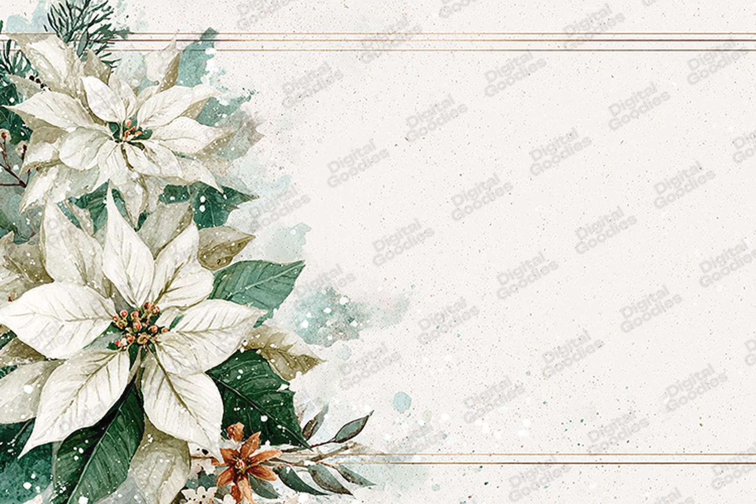 A delicate and elegant watercolor background featuring a beautiful arrangement of white poinsettias and festive green foliage, bordered by a subtle metallic frame on a lightly textured paper background. This design is perfect for creating timeless Christmas cards, winter wedding invitations, holiday party stationery, and sophisticated digital projects, offering a clean, classic, and high-quality aesthetic.
