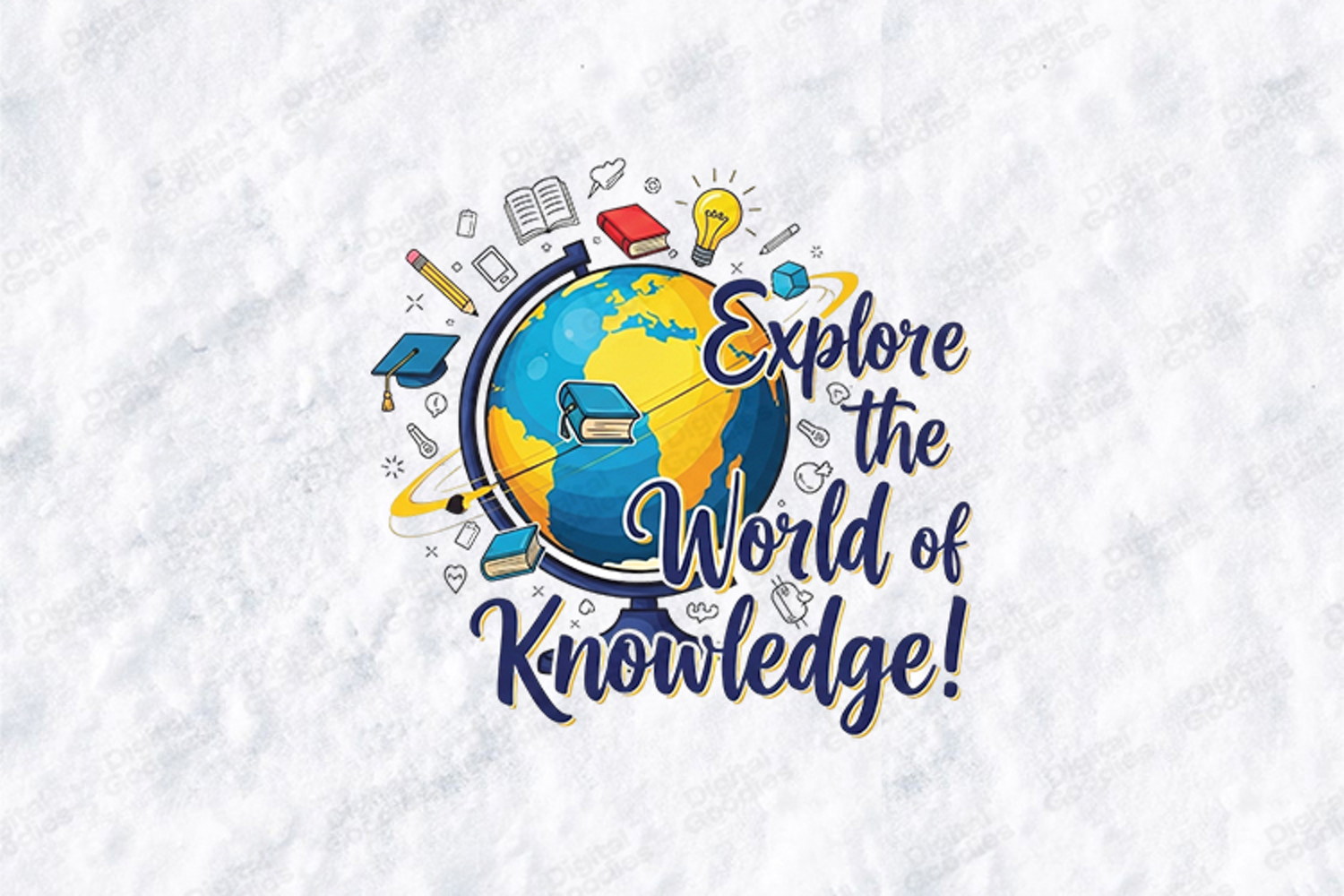 This high-quality digital illustration features a vibrant blue and yellow desk globe surrounded by a whirlwind of academic icons, including graduation caps, open books, lightbulbs, pencils, and mathematical symbols. Paired with bold, scholarly typography, this design perfectly captures the excitement of education and discovery. It is an ideal choice for creating motivational apparel, classroom wall art, and personalized gifts for students and educators alike.