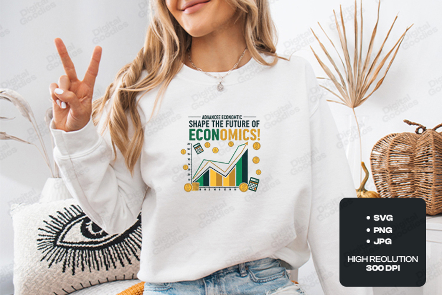 This high-quality digital illustration features a dynamic growth chart accented with gold coins and digital calculators, symbolizing the power of financial literacy and advanced economic study. Paired with bold, modern typography and a vibrant green-and-gold color palette, this design captures the energy of a thriving global economy. It is an ideal choice for economics professors, finance students, and business professionals looking to create personalized apparel, office decor, and engaging academic materials.