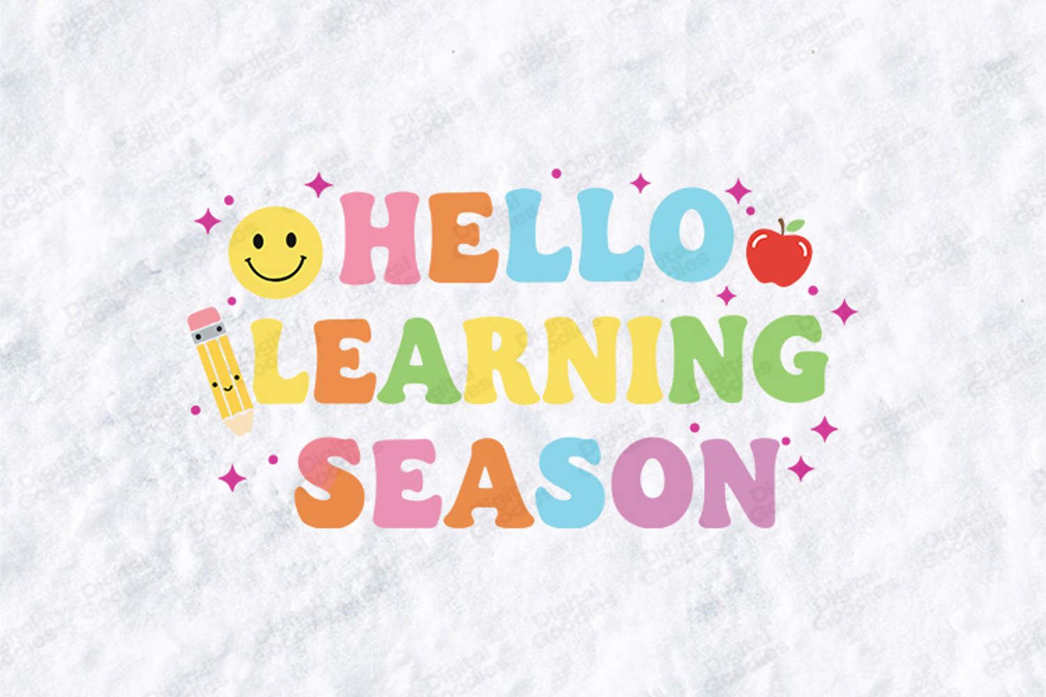 This high-quality digital illustration features a bright and joyful aesthetic perfect for students and creative educators. The design showcases bold, multi-colored "HELLO LEARNING SEASON" typography in a trendy, bubbly font. It is beautifully accented with a friendly, smiling pencil character, a vibrant red apple, and a happy yellow smiley face, all surrounded by twinkling star details. This artwork is an ideal choice for creating high-impact first-day-of-school t-shirts, personalized notebook covers, and uplifting classroom decor.